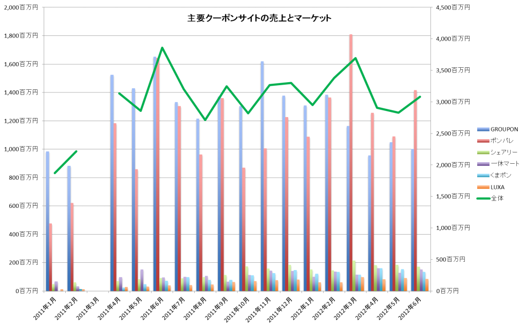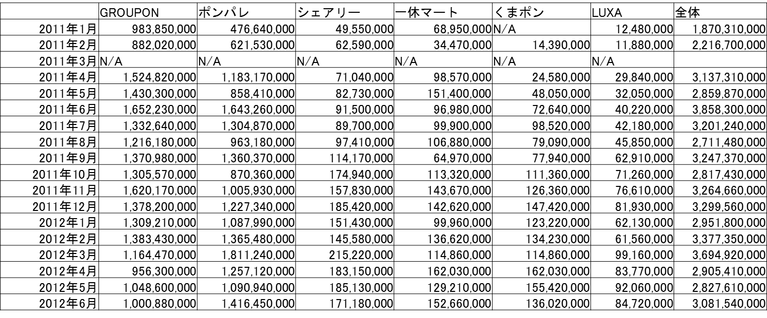 ・ポンパレとグルーポンの2強+フォロワー数社、上位5社はほぼ同じ顔ぶれに落ち着いてきている。